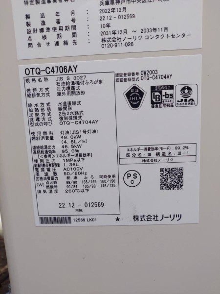亀岡市 ノーリツOTQ-415SAY→ノーリツ石油給湯機付ふろがまOTQ-C4706AY 給湯器交換工事
