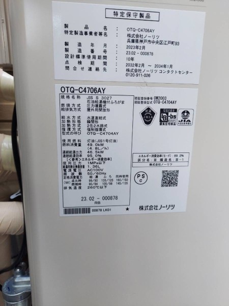精華町 ノーリツ石油給湯機付ふろがまOTQ-4706AY 給湯器交換工事